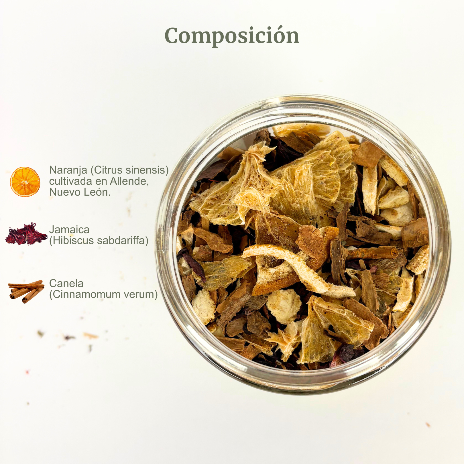 Las naranjas utilizadas en esta infusión provienen de Allende, Nuevo León, cultivadas por el Sr. Abelardo, quien mantiene vivas las prácticas artesanales que nos regalan su aroma tan auténtico.