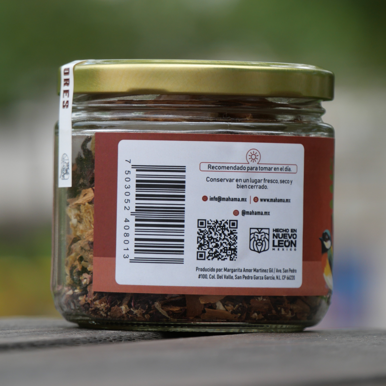 Las infusiones se envasan en frascos de vidrio reutilizable, diseñados para reducir residuos y reflejar la belleza natural de México. Así, lo que empezó en el campo termina siendo tu ritual diario de calma y conexión.
